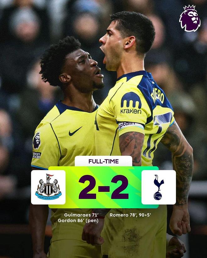 最终,热刺在客场2-2逼平纽卡,联赛近5轮不胜。
