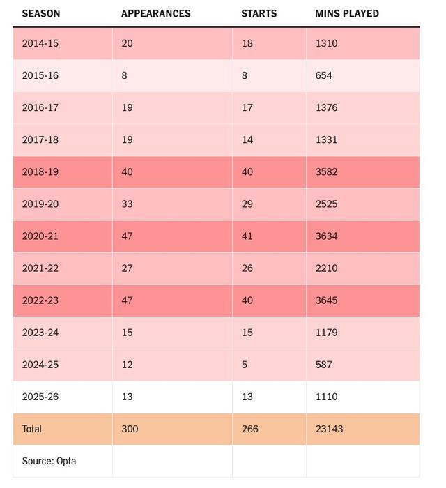 然而,一个月后他就在对埃因霍温的比赛中腿部骨折,遭遇职业生涯最严重的伤。这也成了他在曼联时期的一个不幸模板。他前三个赛季都未超过20场,随后在2018至2023年五个赛季里场均39场。本赛季他很难达到这个数字,因为曼联比赛不多。